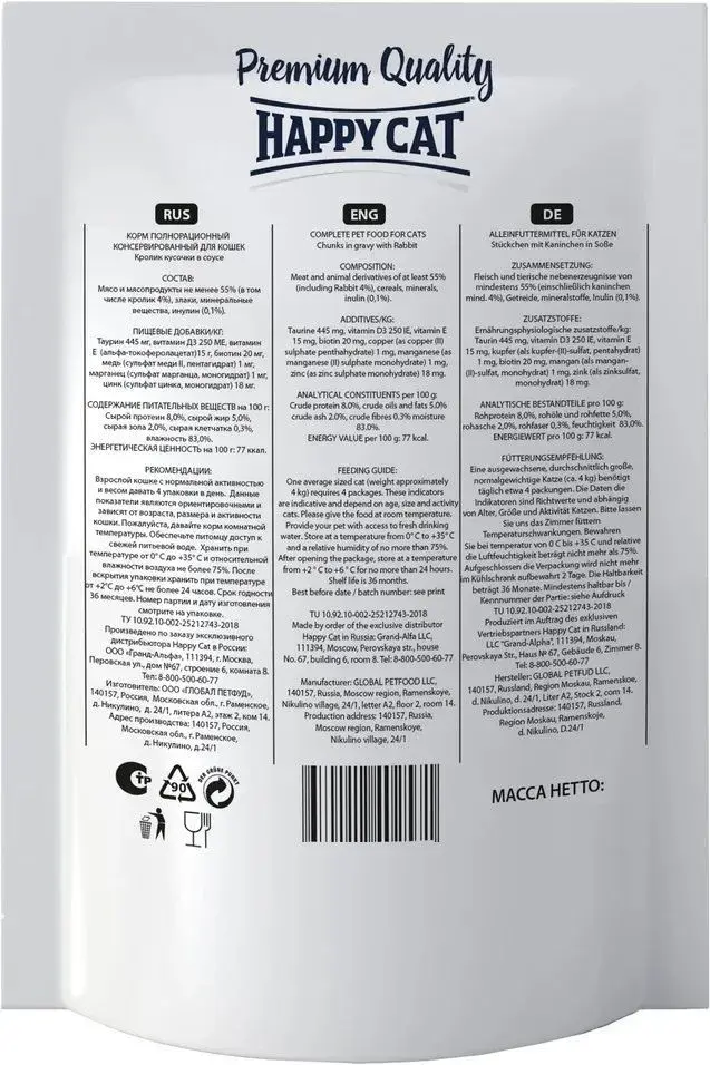 Влажный корм Happy Cat для любых кошек с кроликом в соусе