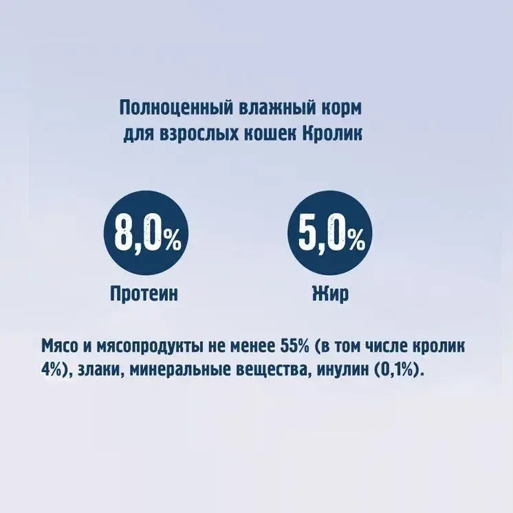 Состав: Мясо и мясопродукты (кролик – 5,0%), злаки, минеральные вещества, инулин (0,1%).