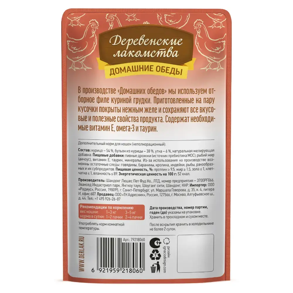 Курица с уткой в нежном желе, 70гр влажный корм для взрослых кошек ДЕРЕВЕНСКИЕ ЛАКОМСТВА