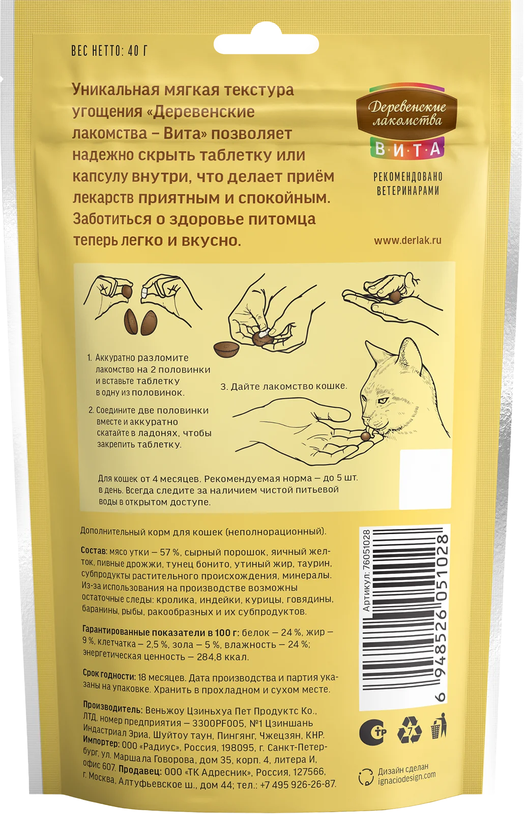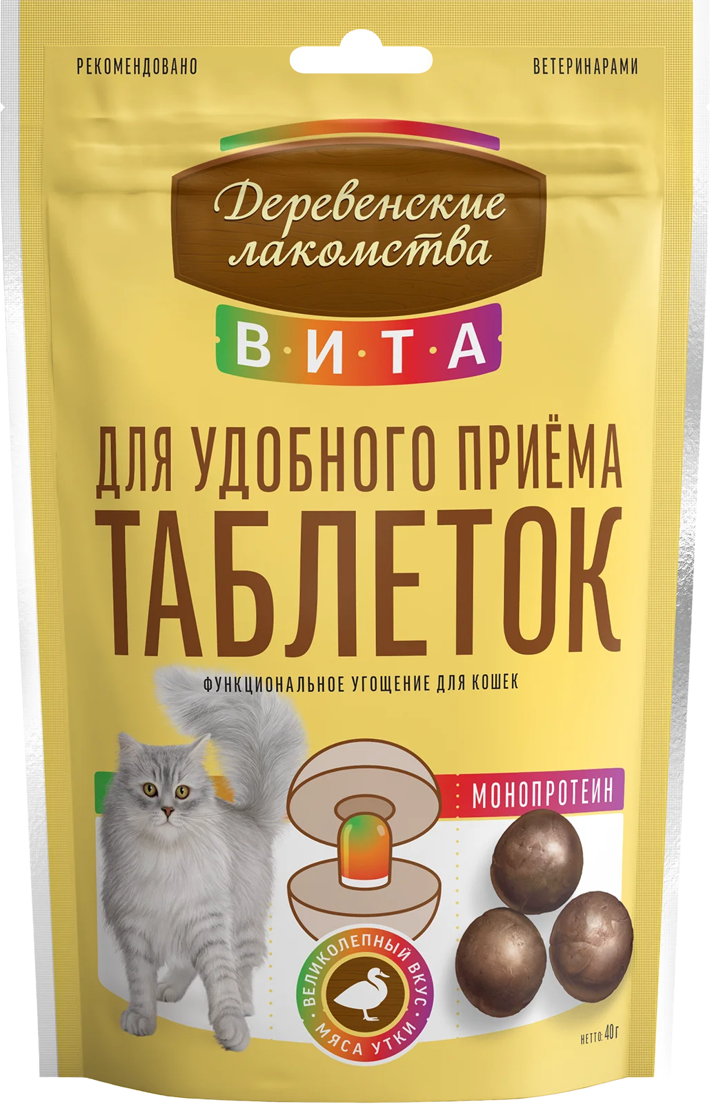 Лакомство для удобного приёма таблеток кошкам со вкусом Утки, 40г Деревенские лакомства