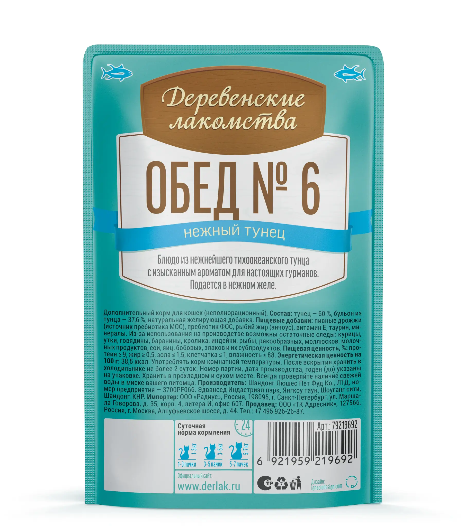 Нежный тунец Обед №6 влажный корм для кошек, 50г Деревенские лакомства