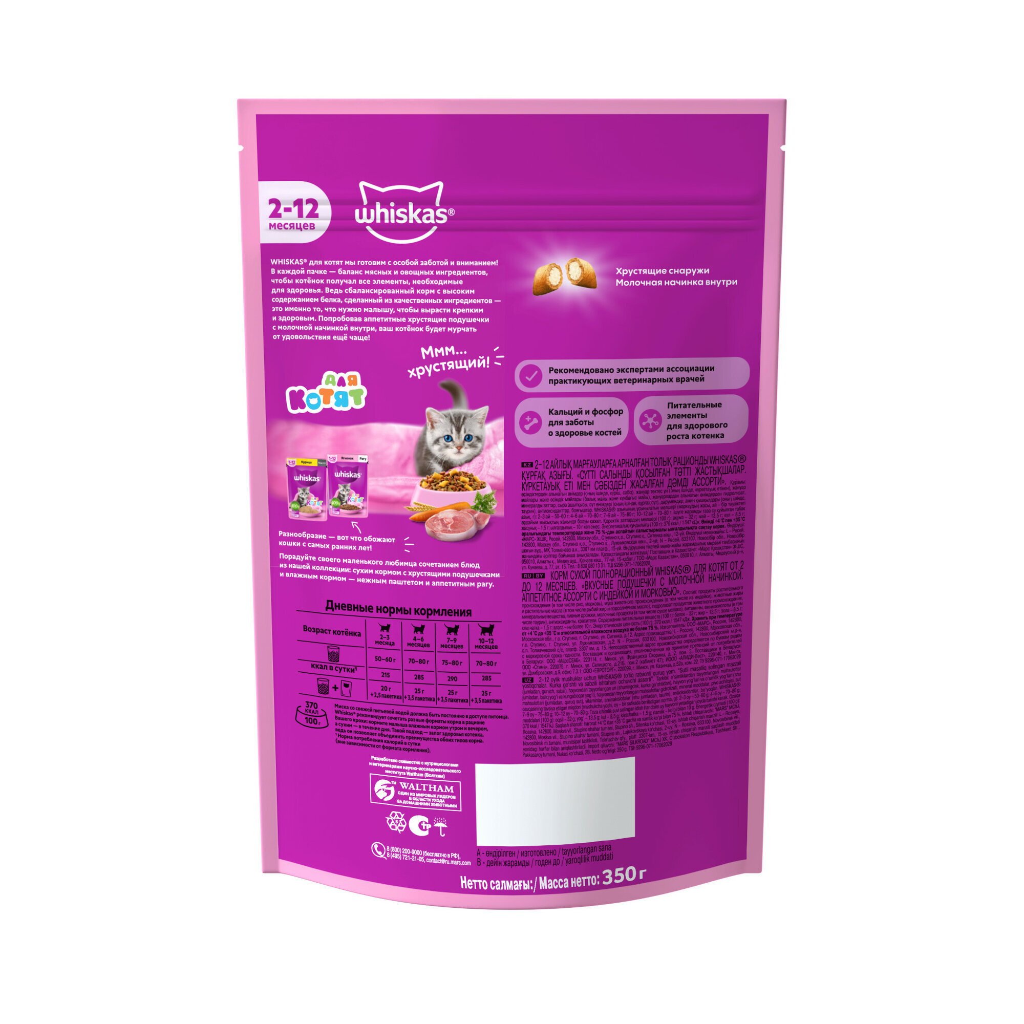 Сухой корм для котят Whiskas Аппетитное ассорти вкусные подушечки с молоком+индейка+морковь 350г