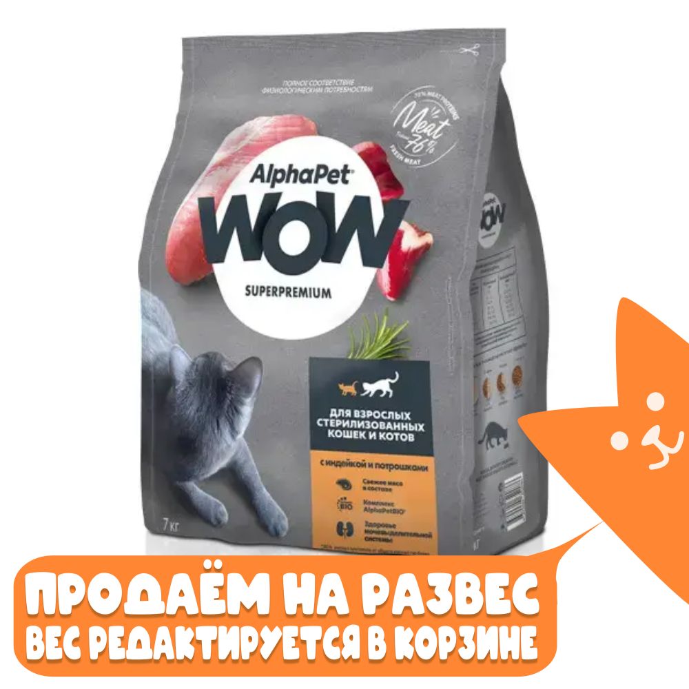 Сухой корм для взрослых стерилизованных кошек с индейкой и потрохами, 7кг AlphaPet WOW Superpremium