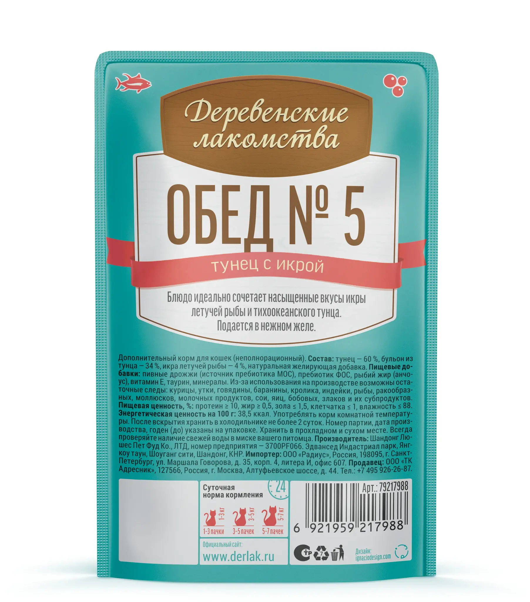 Тунец с икрой Обед №5 пауч для кошки, 50г Деревенские лакомства
