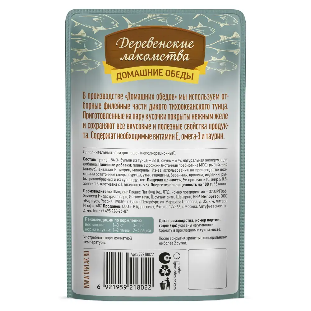 Тунец с окунем в нежном желе, 70гр влажный корм для взрослых кошек ДЕРЕВЕНСКИЕ ЛАКОМСТВА