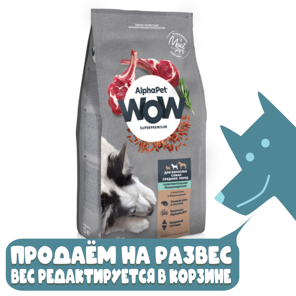 Сухой корм полнорационный для взрослых собак средних пород с чувствительным пищеварением Ягнёнок с бурым рисом, AlphaPet WOW Superpremium РАЗВЕСНОЙ